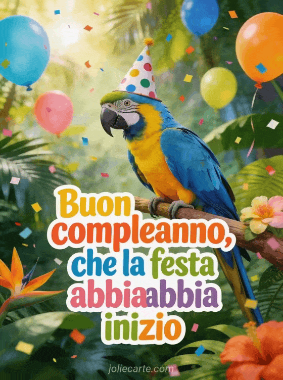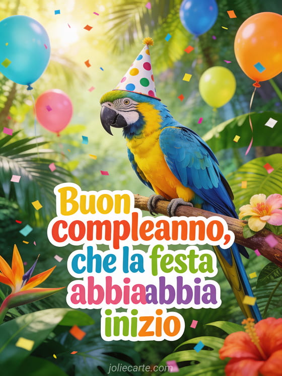 Questo divertente biglietto di compleanno per uomini mostra un esuberante pappagallo ara blu e giallo appollaiato su un ramo tropicale, con un cappellino da festa a pois, circondato da palloncini colorati in una giungla rigogliosa. Il biglietto perfetto per far ridere ogni uomo nel suo giorno speciale. Scopri anche un bel biglietto di compleanno per uomo gratis o un biglietto di buon compleanno per uomo gratis.