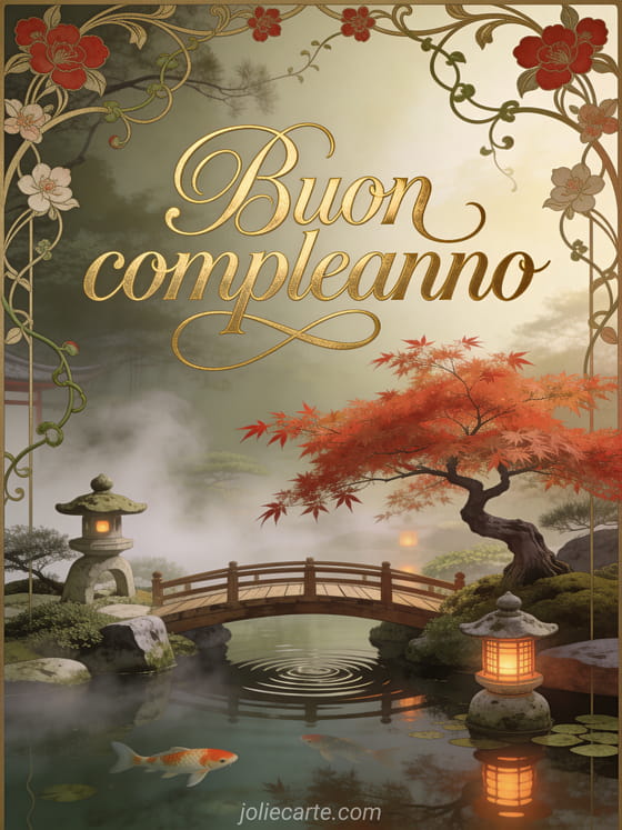 Invia un elegante biglietto di compleanno con un giardino giapponese con un acero rosso fiammeggiante, un ponte di legno su uno stagno con carpe koi e lanterne di pietra. Scopri anche immagini buon compleanno uomo umorismo o buon compleanno uomo umorismo.