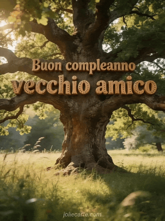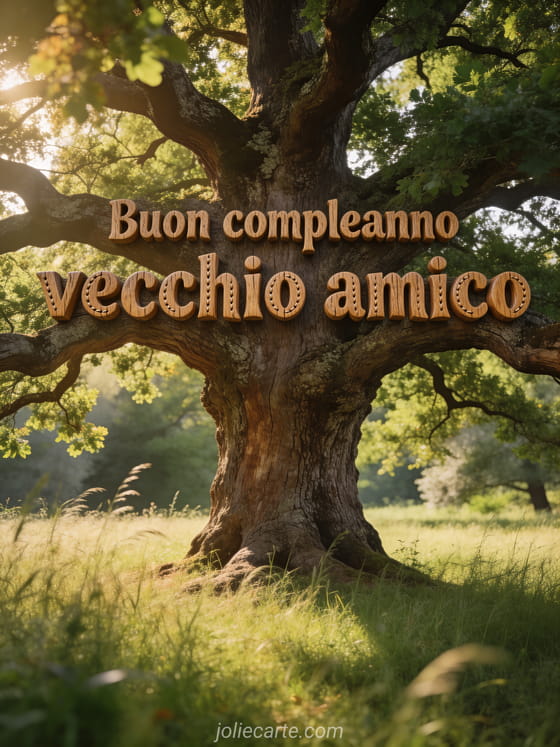Festeggia un vecchio amico con una cartolina di compleanno con una maestosa quercia in un prato verde e luce dorata tra le foglie. Scopri anche augurare un buon compleanno, biglietto buon compleanno gif e messaggio buon compleanno.