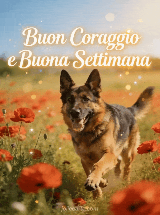 Condividi gioia con questa cartolina di buon coraggio e buona settimana con un allegro pastore tedesco in un campo di papaveri. Scopri anche una cartolina di immagini buongiorno e buona settimana o di buona settimana umorismo animato.