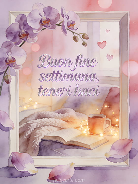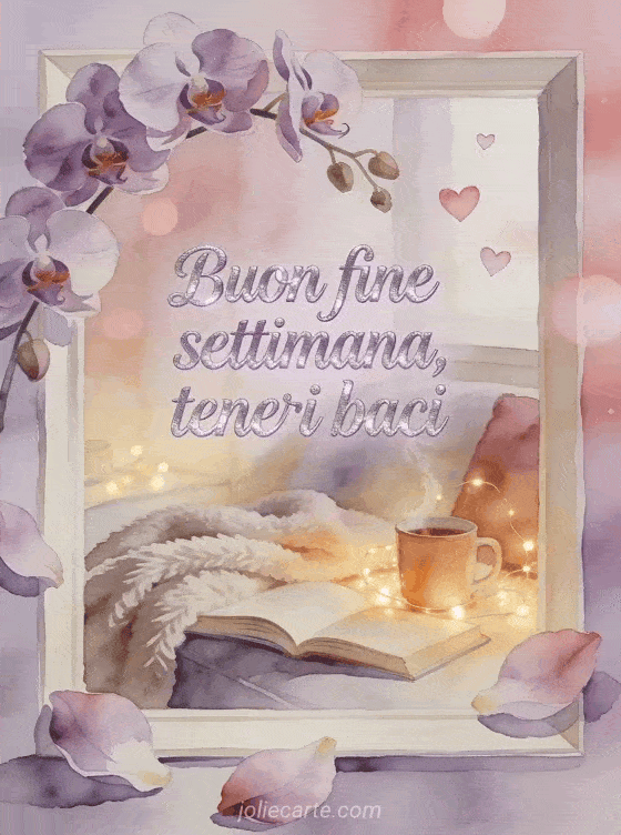 Condividi un'immagine gif di buon fine settimana con baci, lettere lavanda, petali di orchidea, un angolo lettura accogliente, coperta morbida, tazza calda, luci fatate e cuori. Puoi inviare anche buon weekend e baci, buon weekend tanti baci o baci fine settimana.