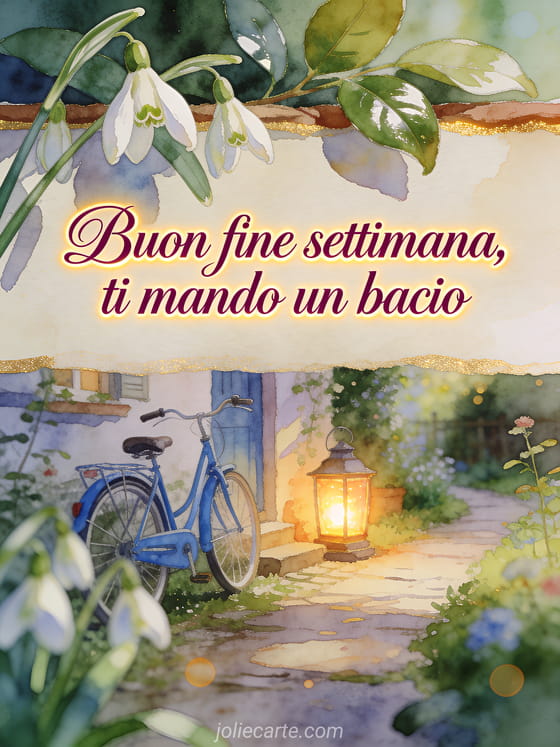 Invia un saluto tenero di buon fine settimana con un bacio, bucaneve sopra il bordo e un sentiero di giardino con una bicicletta blu e una lanterna accesa. Scopri anche passa un buon weekend baci, tenerezza buon weekend baci o buon weekend baci.