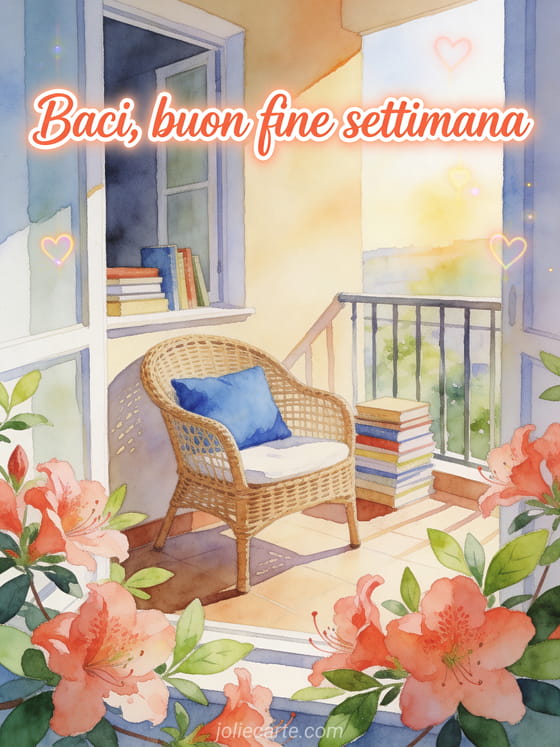 Condividi un saluto caldo di fine settimana con scritte corallo ad acquerello, azalee oltre il bordo, un balcone accogliente, una poltrona in vimini con cuscino blu e libri impilati. Scopri anche un molti baci e buon weekend, un biglietto buon weekend e tanti baci o un saluto baci buon weekend.