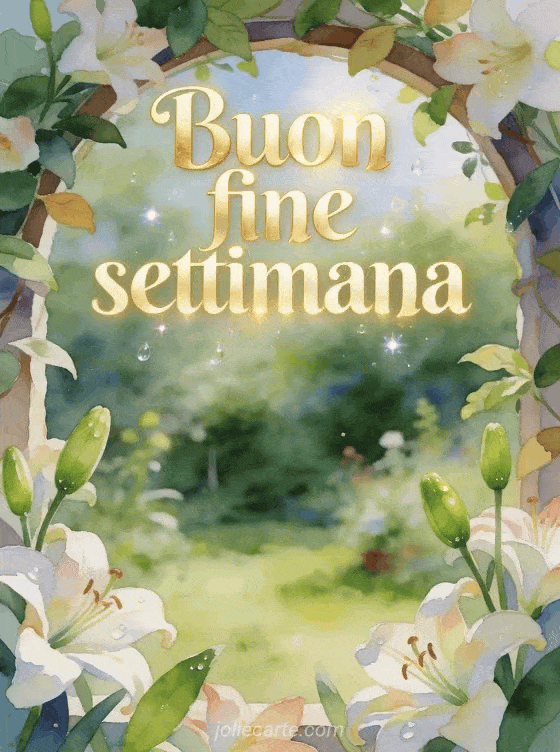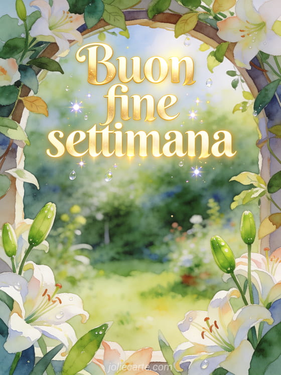Augura un bellissimo fine settimana con scritte ad acquerello, gigli, foglie nuove e un arco di giardino primaverile pieno di rinnovamento. Scopri anche una cartolina immagini buon weekend bacioni, una cartolina buon weekend baci animati o una cartolina buon weekend baci immagine.