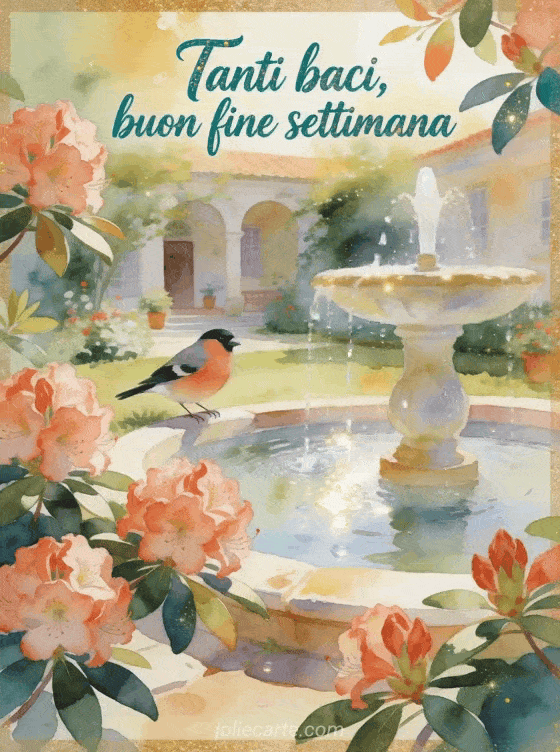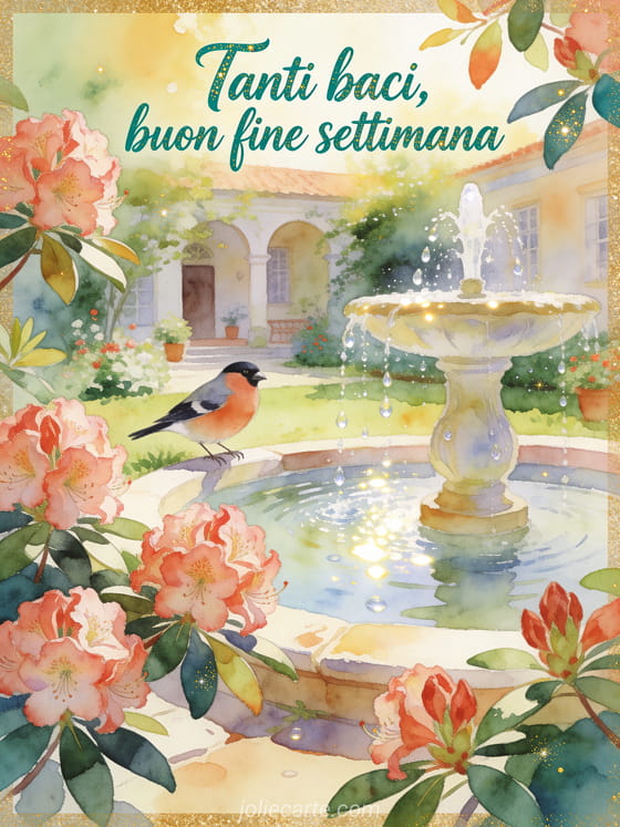 Invia tanti baci per il fine settimana con una cartolina ad acquerello dove rododendri, un ciuffolotto e una fontana creano una tenera scena di cortile. Puoi anche condividere buon weekend divertente umorismo, inviare augurare buon weekend con umorismo o scegliere una immagine buon weekend.