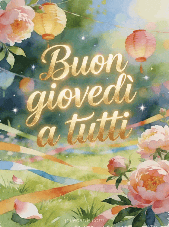 Invia un saluto festivo di buon giovedì a tutti con una celebrazione luminosa in un prato, lanterne di carta, fiori di peonia e nastri colorati sull'erba fresca. Scopri anche un buongiorno giovedì gif, cartoline virtuali gratis buon giovedì o una immagine buon giovedì.