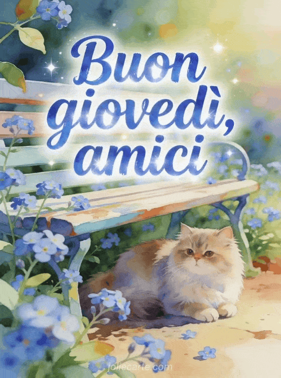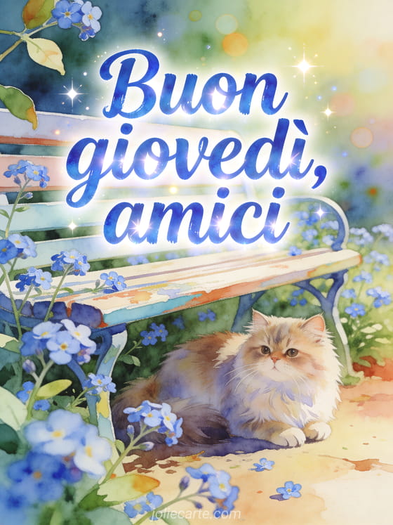 Condividi buon giovedì con gli amici in una cartolina luminosa ad acquerello con un gatto persiano vicino a una panchina da giardino e fiori non-ti-scordar-di-me. Scopri anche buon giovedì mattina immagini, buongiorno giovedì citazione o buon giovedì immagine animata.