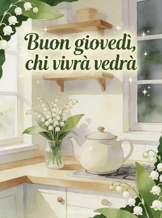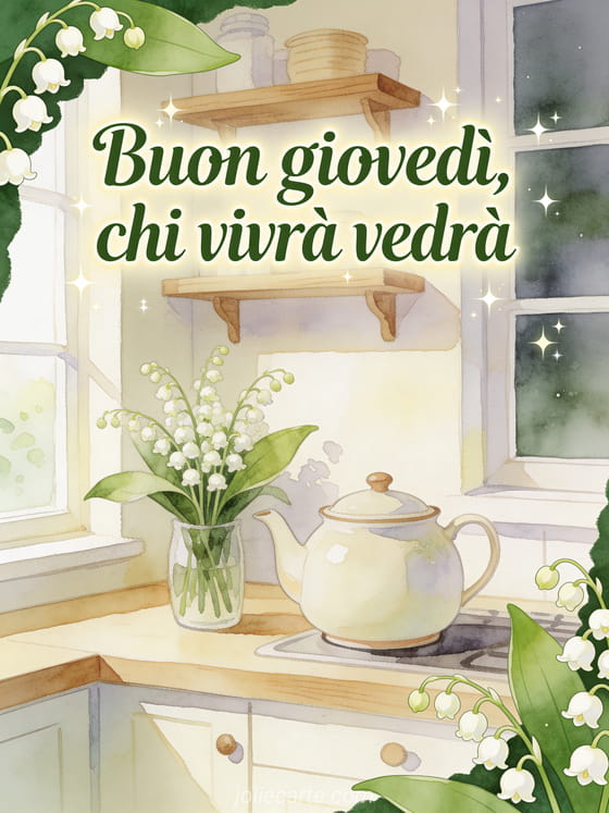 Invia buon giovedì, chi vivrà vedrà con scrittura verde bosco, una teiera accogliente, mughetto e un angolo di cucina luminoso con luce calda. Scopri anche buon giovedì citazione zen, buon giovedì testo o buon giovedì amici miei immagini.
