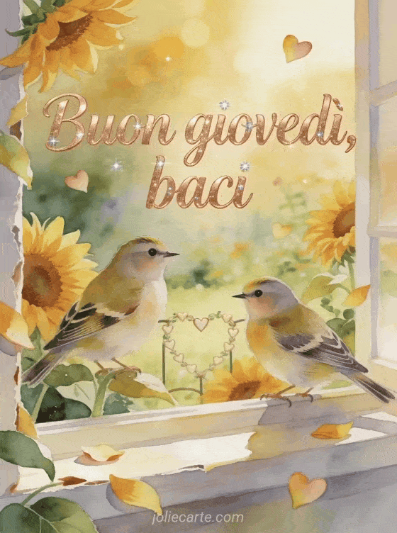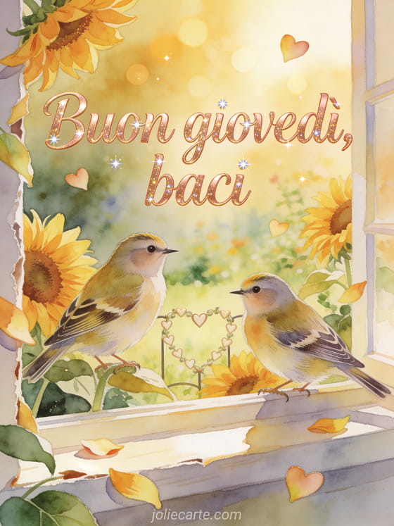 Condividi un luminoso saluto di buon giovedì con baci, girasoli e un'atmosfera da giardino in acquerello. Scopri anche buon giovedì a tutti immagini, buongiorno giovedì gif o cartoline virtuali gratis buon giovedì.