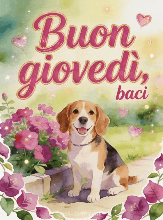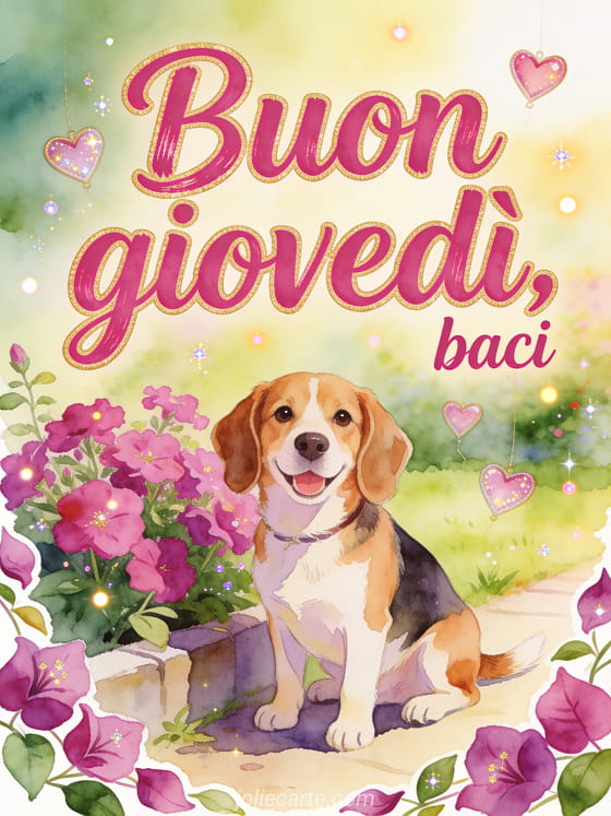 Condividi baci di buon giovedì con un cane beagle allegro in un angolo luminoso del giardino, fiori fucsia e ornamenti a cuore sospesi. Puoi condividere anche buon giovedì gif animata, buon giovedì immagini cuori o buon giovedì sole immagine.
