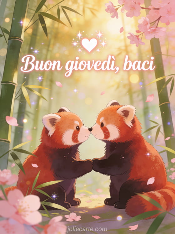 Condividi una immagine di buon giovedì baci con due adorabili panda rossi che si sfiorano il naso in una foresta di bambù mentre cadono fiori rosa di ciliegio. Invia altri auguri affettuosi con buon giovedì buona giornata, bella immagine di buon giovedì o buongiorno giovedì umorismo.