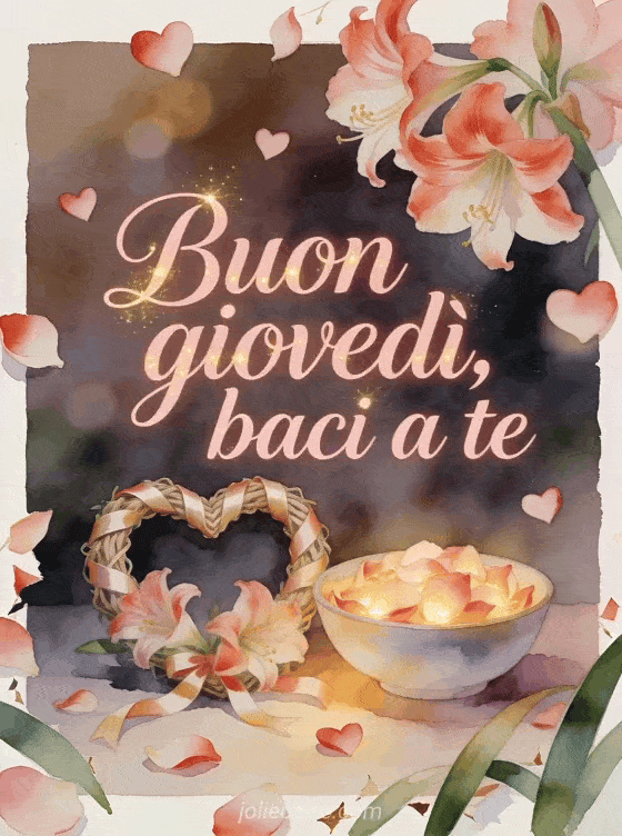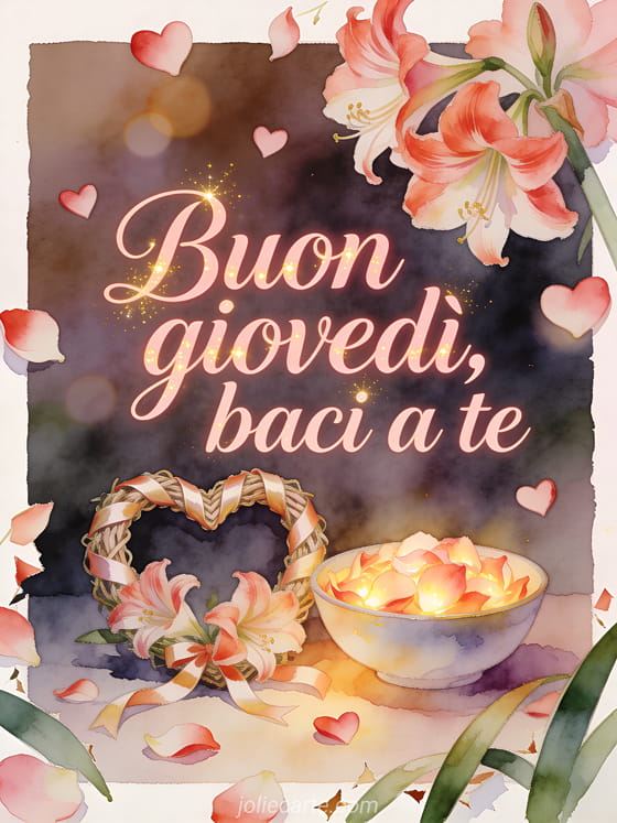 Invia buon giovedì baci immagini con scritta rosa, una corona a cuore di nastro, fiori di amarilli e una ciotola di petali luminosi. Scopri anche buongiorno buon giovedì paesaggio, bel giovedì baci o una buona giornata giovedì immagine.
