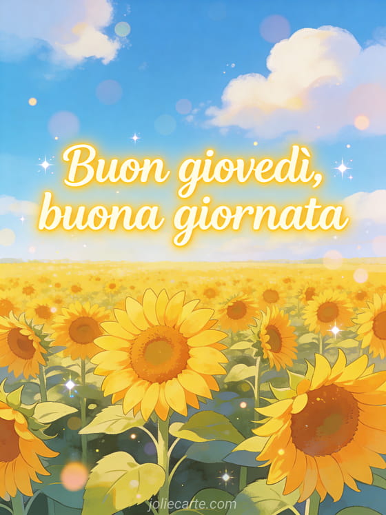 Condividi buon giovedì buona giornata con un allegro campo di girasoli che si estende fino all'orizzonte sotto un cielo azzurro con nuvole soffici. Illumina altri momenti con bella immagine di buon giovedì, buongiorno giovedì umorismo o buon giovedì sotto la pioggia immagine.