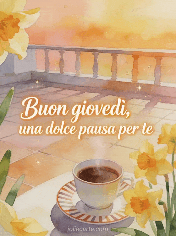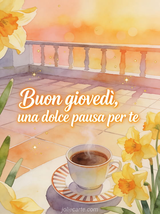 Condividi una dolce pausa del giovedì con una tazza di caffè fumante su una terrazza piastrellata, narcisi luminosi e colori caldi dell'alba. Puoi condividere anche buon giovedì amici immagine, buon giovedì mattina immagini o buongiorno giovedì citazione.