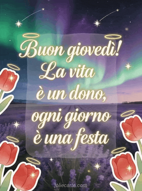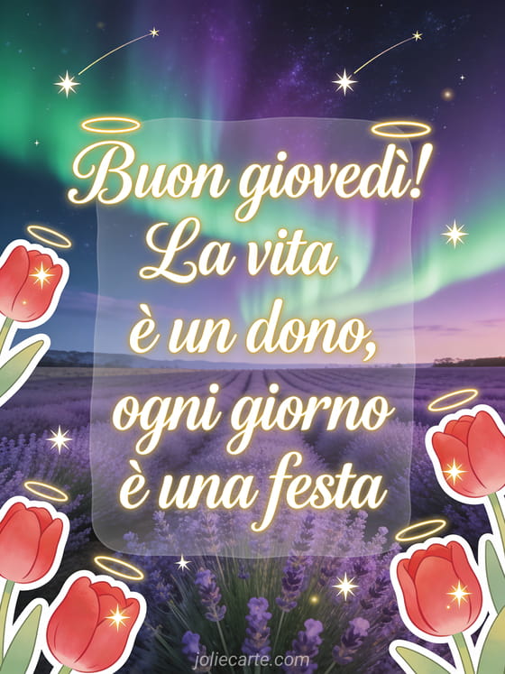 Condividi una citazione ispiratrice di buon giovedì con scritte corsive bianche, tulipani rossi, stelle cadenti e un paesaggio di lavanda in Provenza sotto un'aurora boreale verde e viola. Puoi vedere anche questa buona giornata del giovedì, questa buongiorno è giovedì in immagine o questa buon giovedì baci immagine.