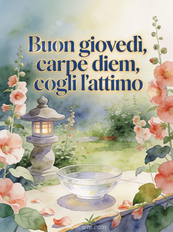 Condividi un buon giovedì tranquillo con un giardino pacifico ad acquerello, malvarose attorno a una lanterna di pietra e una ciotola d'acqua limpida. Puoi condividere anche buon giovedì testo, buon giovedì amici miei immagini o buon giovedì amici poesia.