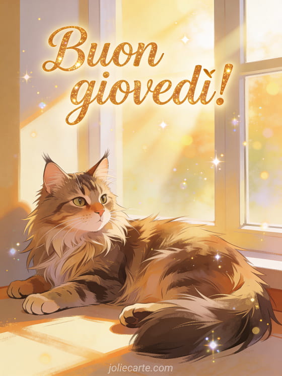 Condividi un saluto incantevole di buon giovedì con scritta elegante e giocosa, bagliore dorato, un gatto Maine Coon disteso vicino a una finestra soleggiata, scintille sospese e toni caldi. Scopri anche buon giovedì donna immagini, buongiorno giovedì immagini o immagini baci del giovedì.
