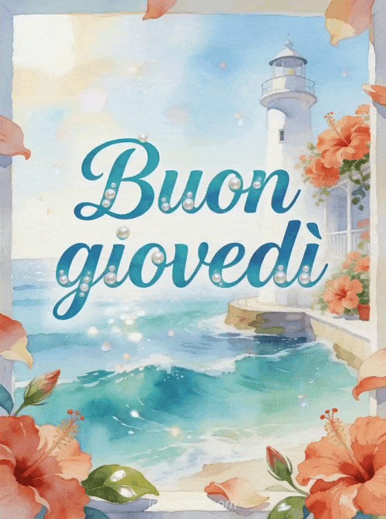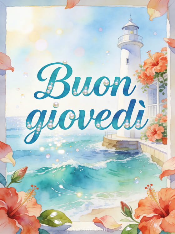 Invia buon giovedì con scrittura blu oceano, un angolo luminoso sul mare, un faro bianco, fiori di ibisco corallo e onde turchesi. Scopri anche buon giovedì immagine scintillante, buongiorno buon giovedì gif animata o buon giovedì gif.