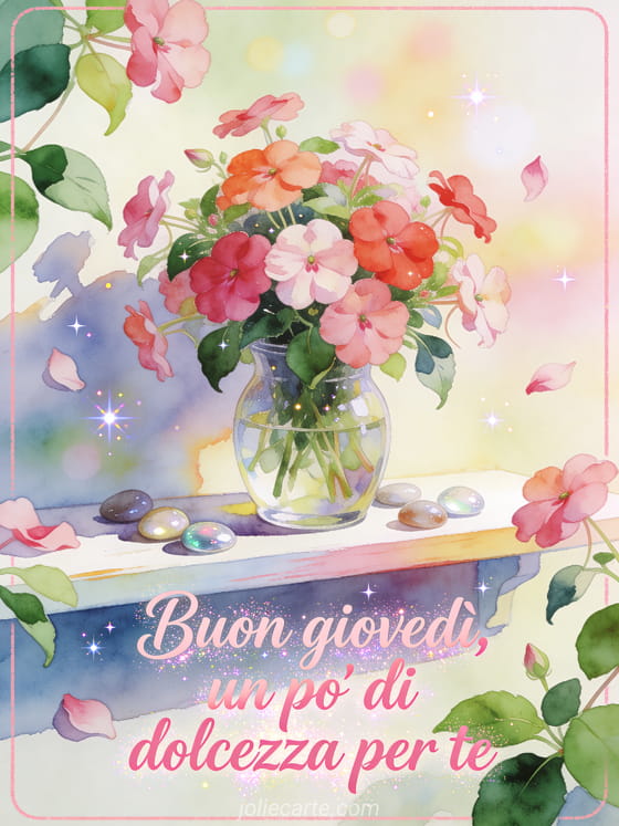 Condividi un biglietto dolce di buon giovedì con un vaso di vetro pieno di fiori di impatiens, pietre decorative e uno scaffale dipinto luminoso. Puoi anche inviare immagini di buongiorno del giovedì, buon giovedì baci immagini o un buongiorno buon giovedì paesaggio.