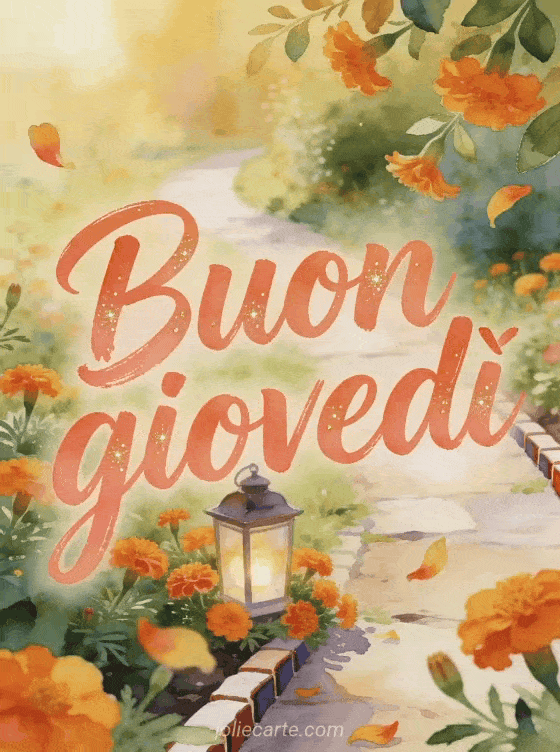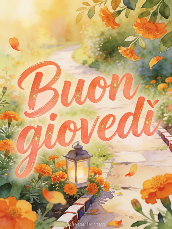 Invia un saluto gioioso di buon giovedì con scritte corallo calde, scintille dorate, un fresco sentiero in giardino al mattino, calendule, una piccola lanterna e luce dorata soffusa. Puoi condividere anche buongiorno giovedì citazione, buon giovedì immagine animata o buongiorno buon giovedì baci immagini.