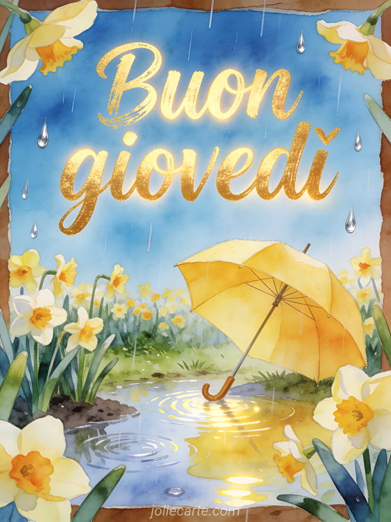 Condividi un buon giovedì in un giardino piovoso e allegro, con narcisi, un ombrello giallo, pozzanghere luminose e gocce argentate. Scopri anche buongiorno buon giovedì e buona giornata, buon giovedì immagini di fiori o immagini di buongiorno del giovedì.