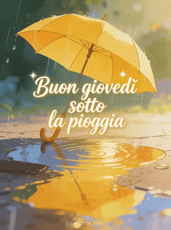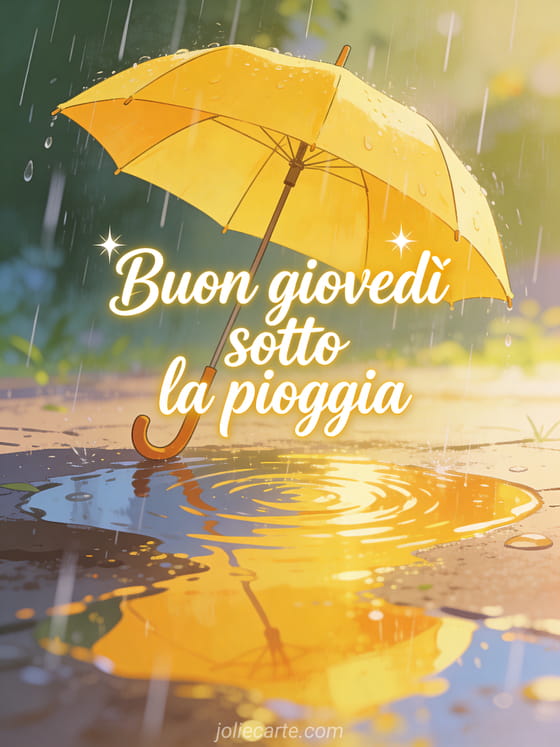 Condividi buon giovedì sotto la pioggia con corsivo morbido, scintillio delicato, un ombrello giallo sotto pioggia vivace, riflessi luminosi nelle pozzanghere e luce calda accogliente. Scopri anche cartoline per augurare un buon giovedì, belle immagini animate buon giovedì o buongiorno buon giovedì.