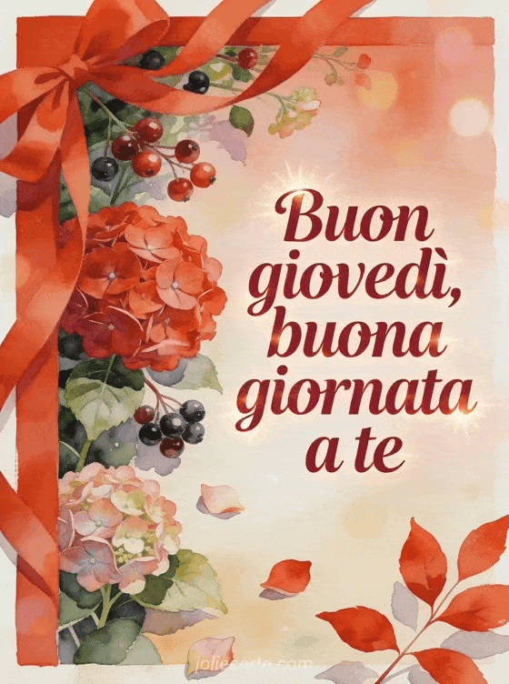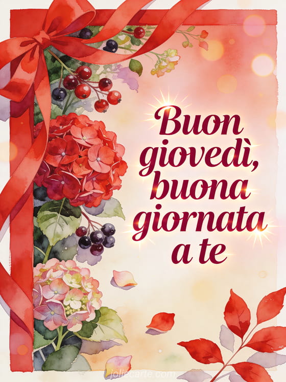 Condividi un messaggio caloroso di buon giovedì con scritte rubino, ortensie rosse, nastri e bacche lucide in un giardino ad acquerello. Puoi inviare anche una buon giovedì baci gif animata, buon giovedì a tutti immagini o una buongiorno giovedì gif.