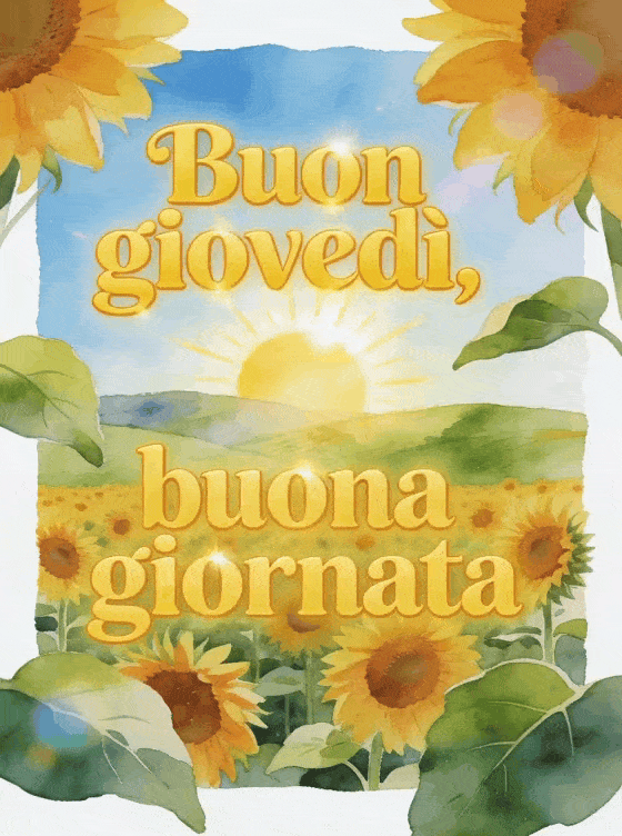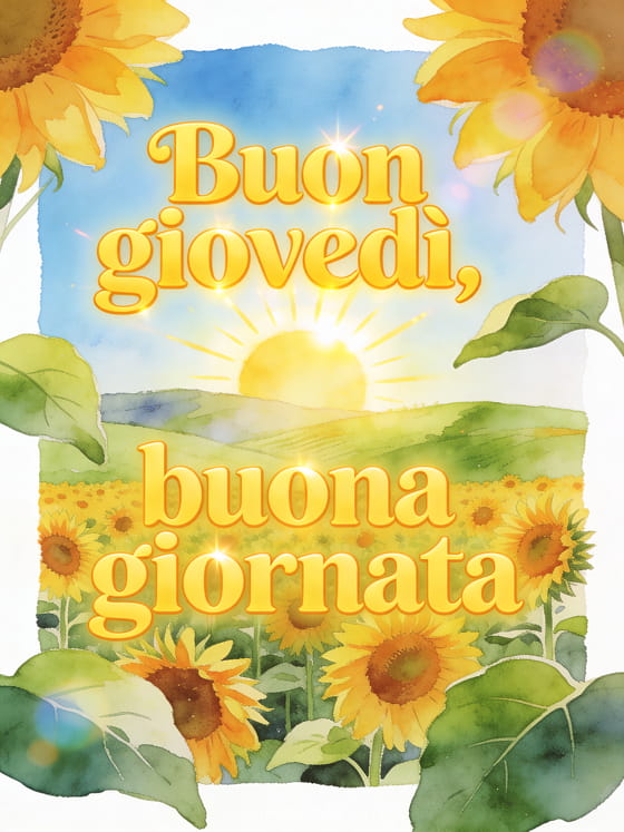 Invia un messaggio luminoso del giovedì con un sole brillante sopra girasoli e colline verdi ad acquerello. Scopri anche una buon giovedì rosso gif, una buon giovedì baci gif animata o buon giovedì a tutti immagini.