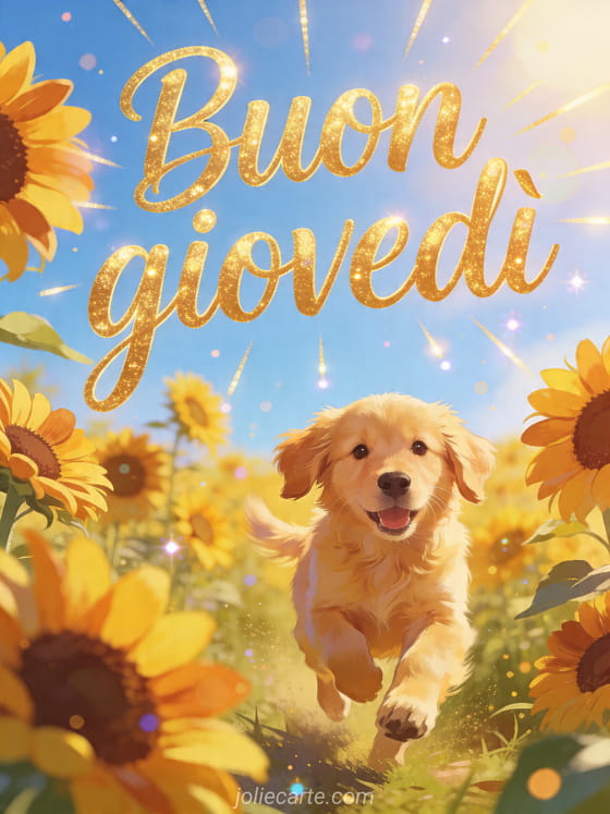 Rendi più luminoso il giorno con questo biglietto di giovedì che mostra un cucciolo di golden retriever mentre corre in un campo di girasoli sotto un cielo estivo azzurro. Scopri anche buona serata di giovedì, buon giovedì immagine gratis o gif buon giovedì umorismo.