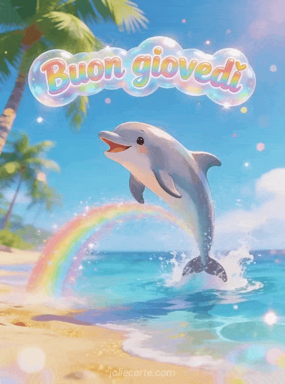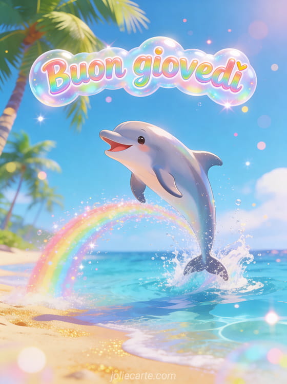 Invia un augurio luminoso di buon giovedì con lettere a bolle in arcobaleno e un delfino gioioso che salta dall'acqua azzurra cristallina vicino a una spiaggia tropicale. Scopri anche cartolina animata buon giovedì, buon giovedì baci o buongiorno buon giovedì cartolina.