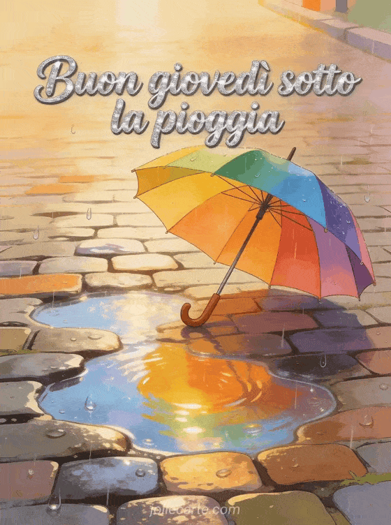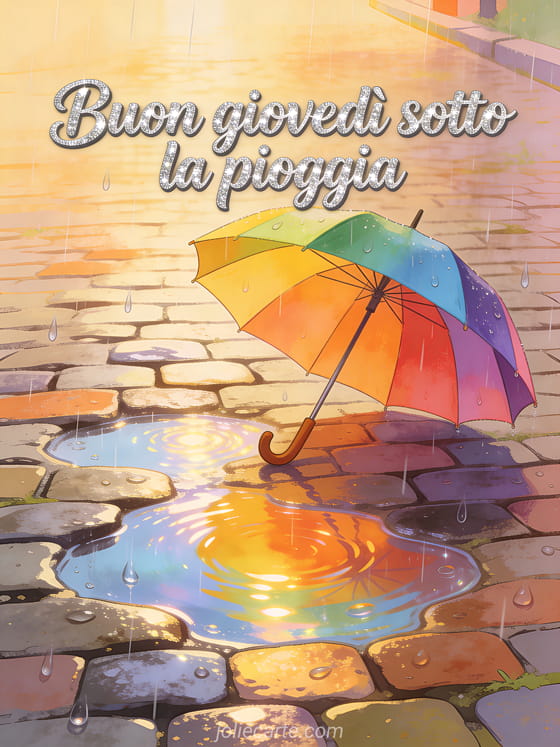 Condividi buon giovedì sotto la pioggia con corsivo marcato, scintillio argentato, un ombrello colorato accanto a pozzanghere luminose, ciottoli bagnati dalla pioggia e luce calda. Scopri anche buongiorno buon giovedì immagine, buongiorno buon giovedì baci immagini o buon giovedì sorriso.