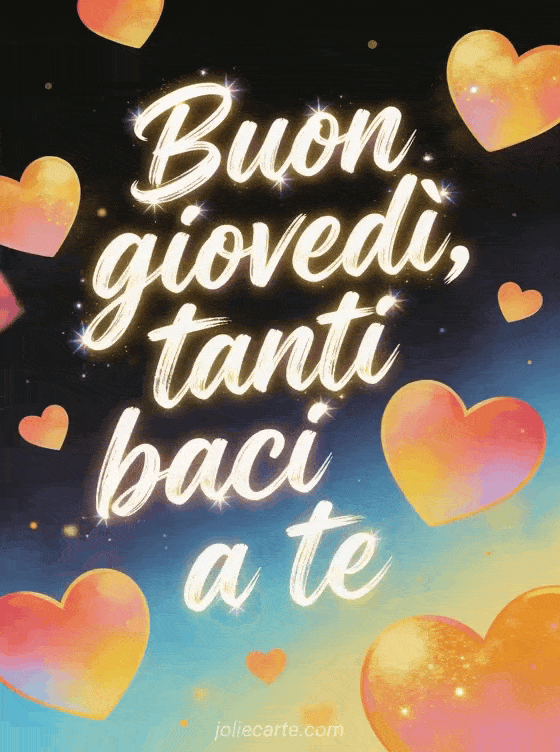 Condividi tanti baci del giovedì con scritta a pennello vivace, bagliore scintillante, grandi cuori nella luce dorata, sfumature vivaci e atmosfera affettuosa. Scopri anche baci del giovedì gif, buon giovedì sotto la pioggia gif o buongiorno buon giovedì immagine.