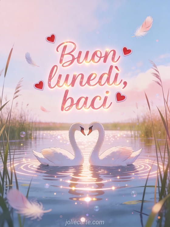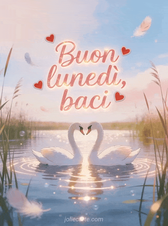 Invia baci di buon lunedì con due cigni che scivolano vicini su un lago scintillante incorniciato da canne, cuori e piume morbide. Scopri anche gifs buon lunedì buona settimana, gif animati buon lunedì o buona settimana e buon lunedì gif.