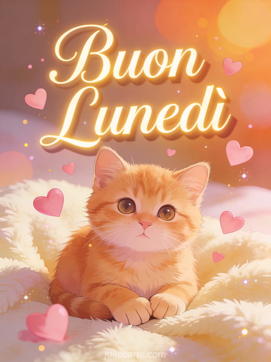 Inizia la settimana con amore inviando questo adorabile biglietto di buon lunedì. Un tenero gattino rosso con occhi amorevoli è circondato da cuori rosa fluttuanti in un'accogliente atmosfera mattutina. Scopri anche un biglietto di buon lunedì o un biglietto positivo di lunedì con citazione.