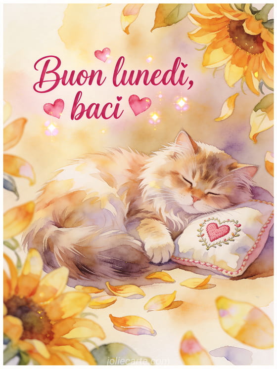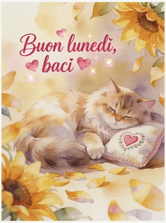 Condividi una cartolina dolce di buon lunedì con baci, un gatto persiano addormentato, un cuscino con cuori e petali di girasole. Scopri anche una buon lunedì cuore gif, una buon lunedì piovoso immagine o una buongiorno buon lunedì immagini gif.