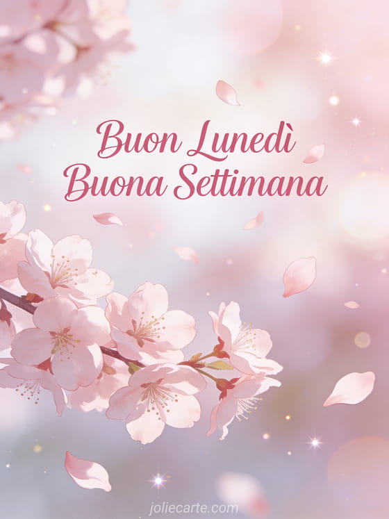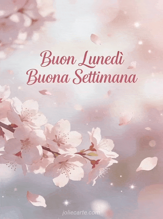 Condividi un dolce saluto del lunedì con petali di ciliegio e un messaggio pieno di tenerezza. Scopri anche una buon lunedì e buona settimana umorismo o una gif buon lunedì e buona settimana.