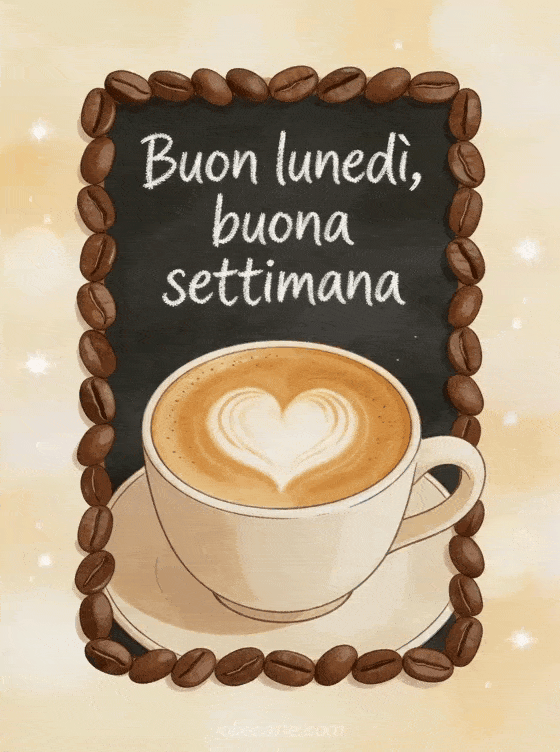 Invia un biglietto di Buon lunedì con latte art a cuore in una tazza di ceramica per un inizio di settimana pieno di calore. Scopri anche buona settimana buon lunedì, buon lunedì e buona settimana gif e buon lunedì citazione.