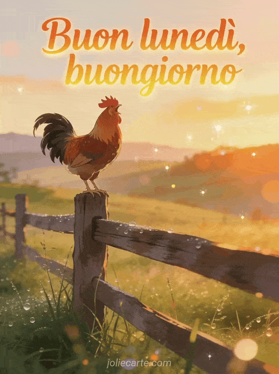 Invia un luminoso augurio di buon lunedì e buongiorno con lettere in stile alba e un gallo che canta su una recinzione rustica di fattoria. Scopri anche buongiorno e buon lunedì gif, cartoline gratis buon lunedì o buon lunedì baci gif.