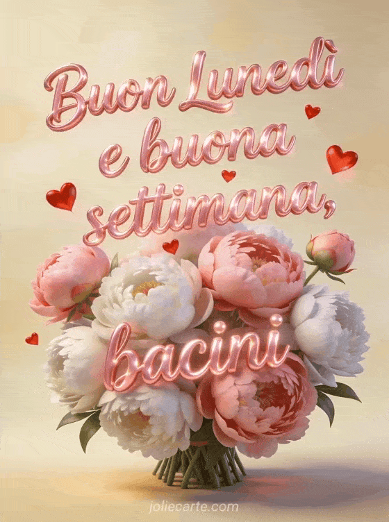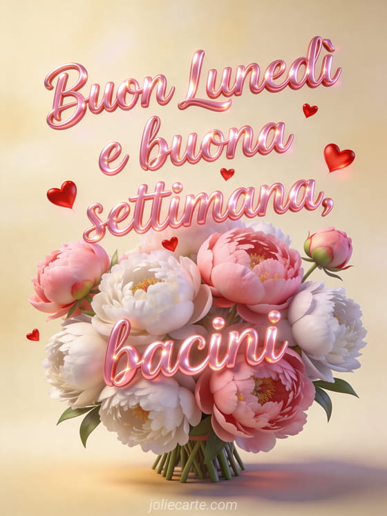 Buon lunedì e buona settimana bacini un tenero biglietto di lunedì con cuori e peonie per una buona settimana