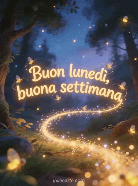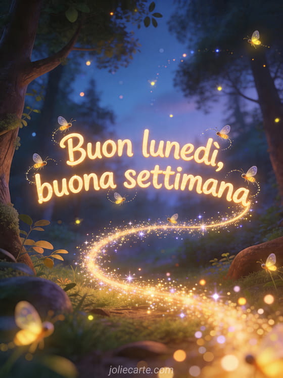 Invia un magico biglietto di Buon lunedì con lucciole danzanti in una foresta al crepuscolo per un inizio incantato. Scopri anche buon lunedì citazione, spiritoso gif buon lunedì divertente e buongiorno e buon lunedì.