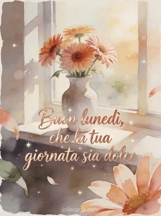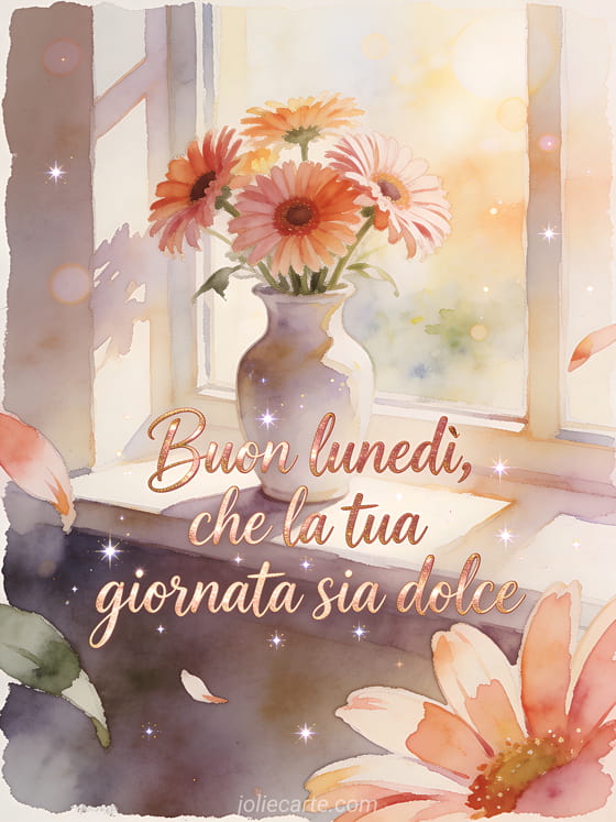 Augura un buon lunedì dolce con calligrafia oro rosa, un vaso di porcellana con gerbere su un davanzale soleggiato e calda luce ad acquerello. Scopri anche buon lunedì immagine scintillante, buon lunedì freddo immagine o buon lunedì immagini animate.
