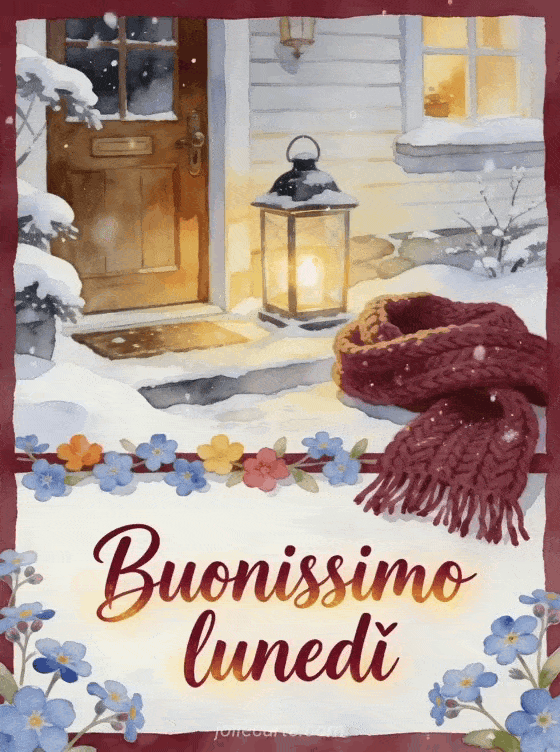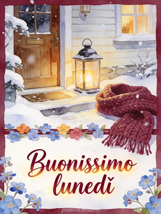 Augura buonissimo lunedì con la soglia innevata di un cottage, una lanterna accesa, una sciarpa lavorata a maglia e petali di non-ti-scordar-di-me che colorano la luce invernale ad acquerello. Condividi questa cartolina confortante e scopri anche buon lunedì immagini animate, buon lunedì belle immagini o buon lunedì caldo immagine.