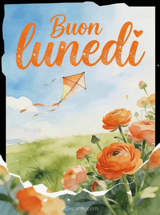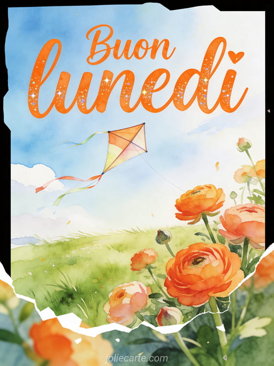 Augura un buon lunedì con un aquilone che danza sopra un prato verde, ranuncoli e cielo luminoso in vivaci colori ad acquerello. Condividi questa cartolina gioiosa e scopri anche buon lunedì gif, buon lunedì sole immagine o buon lunedì baci belle immagini.