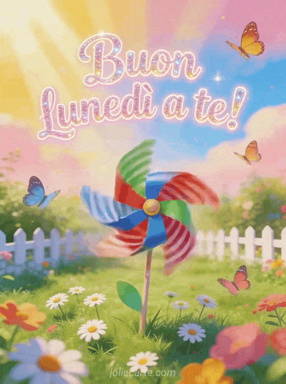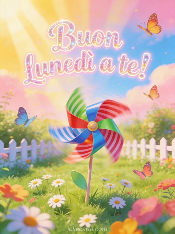 Invia un allegro saluto di buon lunedì con una girandola colorata in un giardino soleggiato. Scopri anche immagini gratis buon lunedì e buona settimana, buon lunedì belle immagini o caffè ottimo buon lunedì e buona settimana.