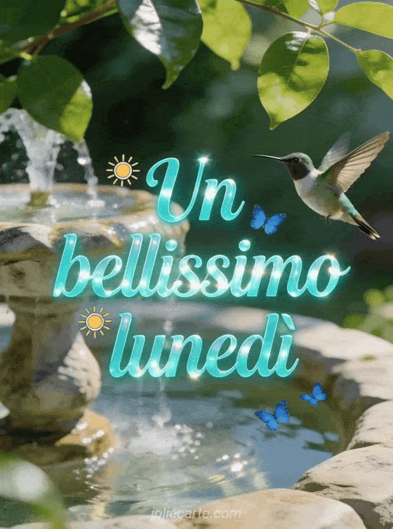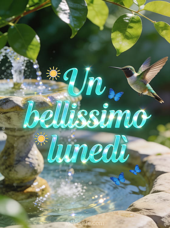 Invia un bellissimo lunedì con un colibrì fotorealistico che sfreccia accanto a una fontana di pietra scintillante e foglie verdi lucide. Scopri anche immagine gratuita buon lunedì buona settimana, buongiorno buon lunedì e buona settimana baci o buongiorno lunedì immagine.