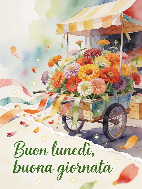 Inizia la settimana con una cartolina di buon lunedì che mostra un carretto del mercato pieno di zinnie, nastri e colori ad acquerello. Scopri anche buon lunedì gif animate, buon lunedì gif o buon lunedì sole immagine.