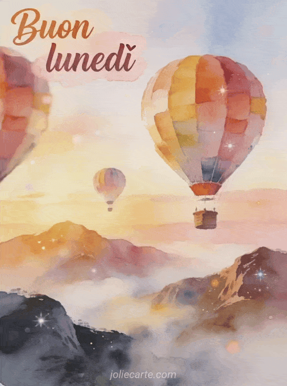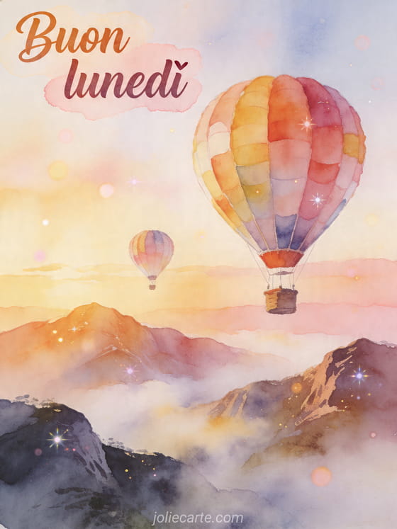 Invia un biglietto di Buon lunedì con mongolfiere colorate sopra montagne avvolte nella nebbia per iniziare la settimana con ispirazione. Scopri anche buon lunedì divertente, buon lunedì e buona settimana e coraggio buon lunedì.