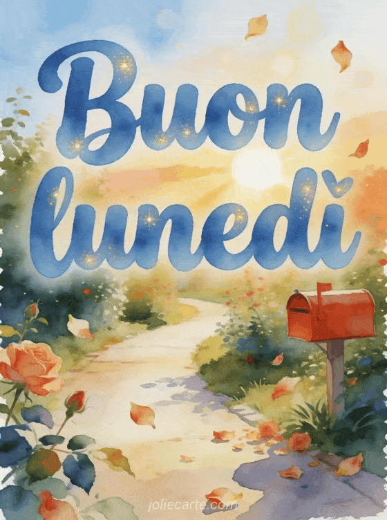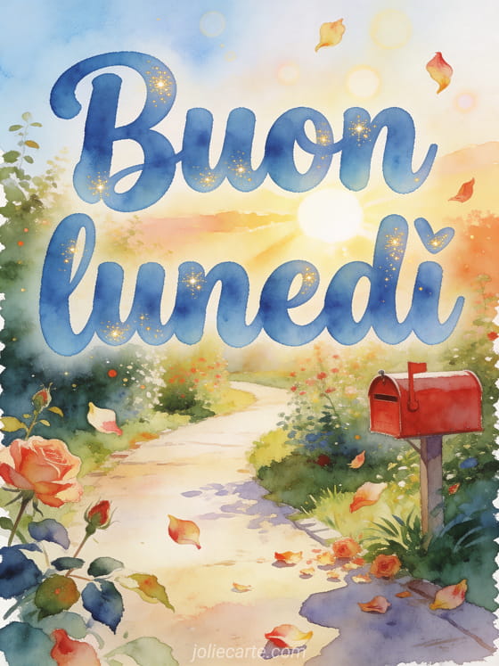 Condividi buon lunedì con un allegro sentiero di giardino all'alba ad acquerello, una cassetta delle lettere rossa, petali fluttuanti di rose antiche e dolci scintille dorate. Puoi inviare anche buon lunedì belle immagini, una buon lunedì caldo immagine o una buon lunedì e buona settimana gif animata gif.