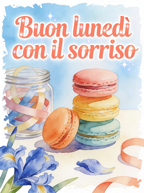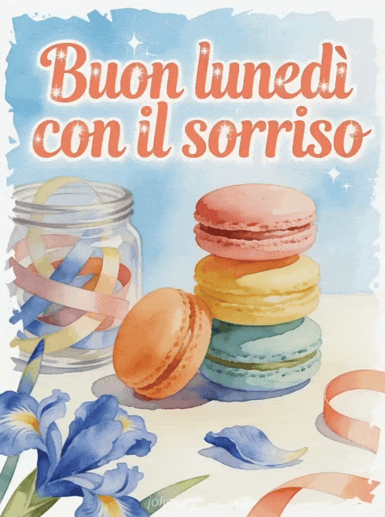 Invia un saluto vivace del lunedì con scritte corallo, macaron colorati, nastri arricciati, fiori di iris blu e scintille allegre. Scopri anche buongiorno del lunedì gif, buona settimana e buon lunedì gif o lunedì buongiorno gif.