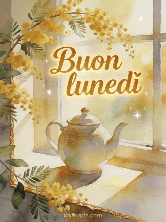 Invia un saluto caldo di buon lunedì con una teiera di porcellana vicino a una finestra soleggiata e rami freschi di mimosa nella luce accogliente del mattino. Scopri anche una buongiorno buon lunedì immagine, una buongiorno buon lunedì gif animata o una gif buon lunedì donna.